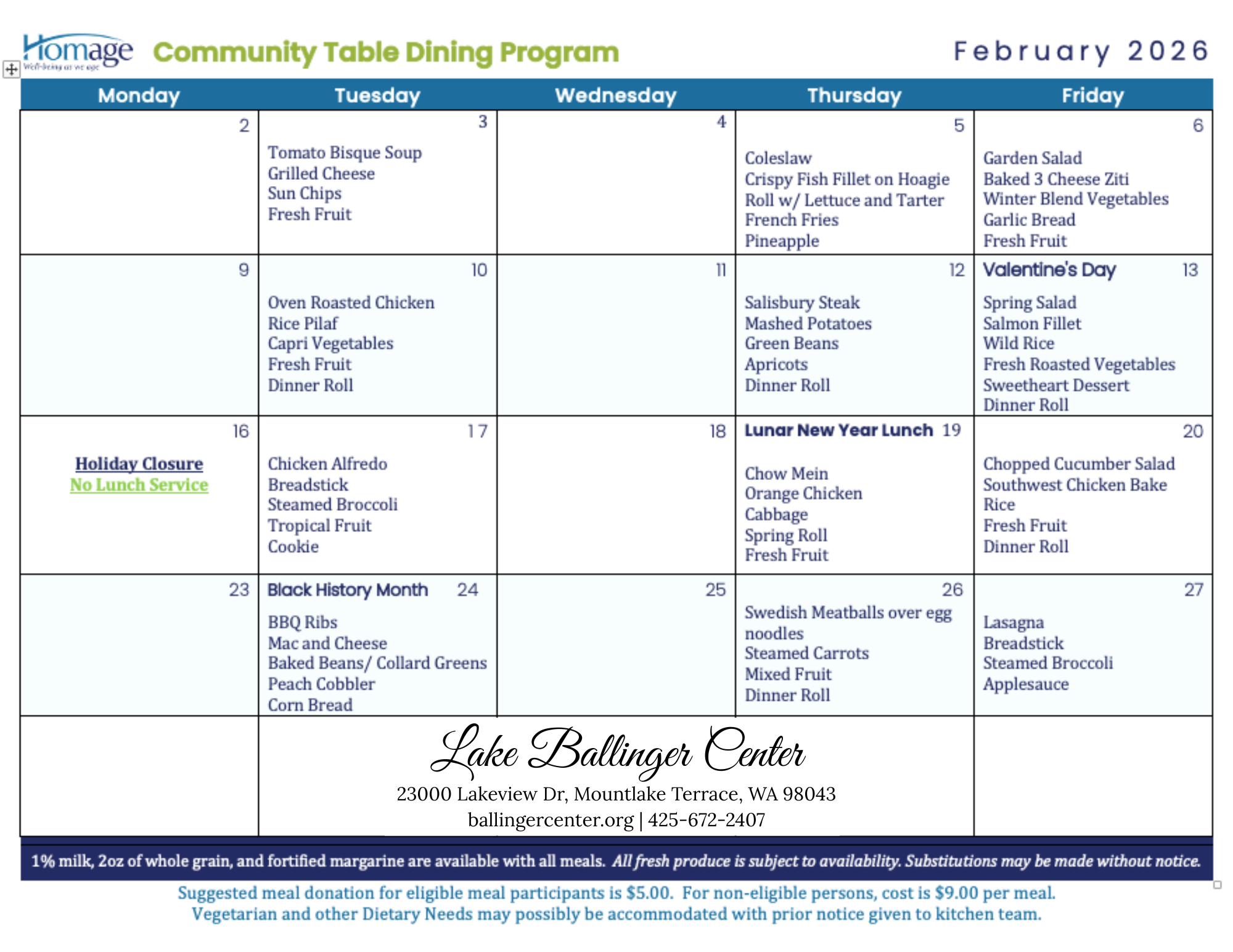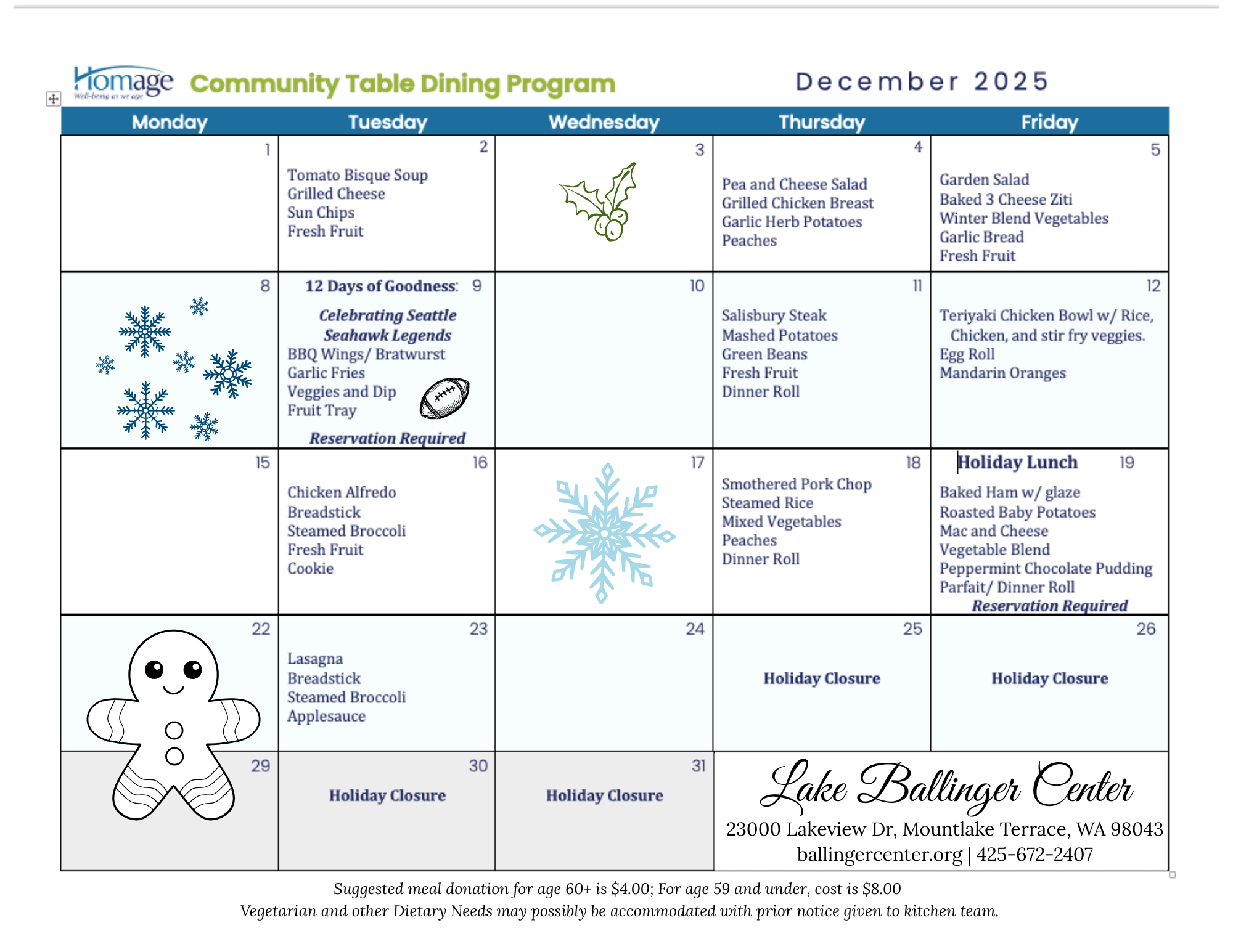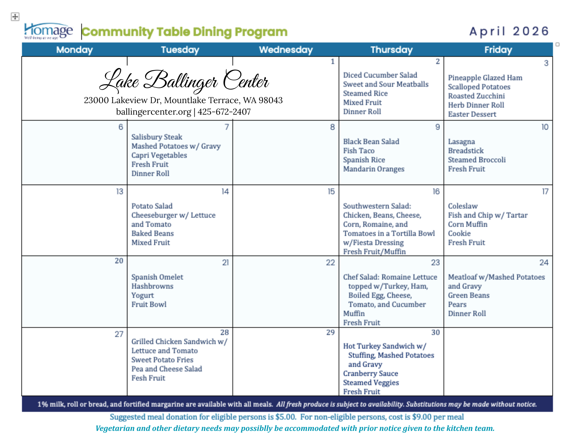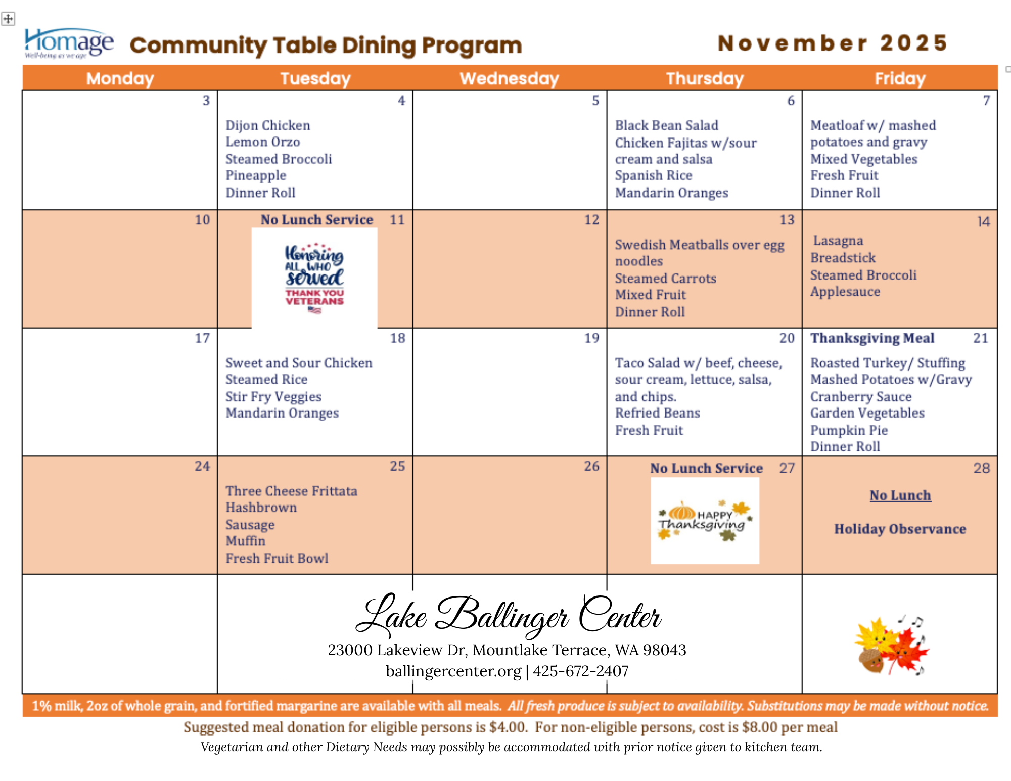 3 - If you wish to show your appreciation for this program, kindly place donations in the Lake Ballinger Center Donations Jar. Please note, these are separate from any contributions made to the federally supported Homage Meal program.